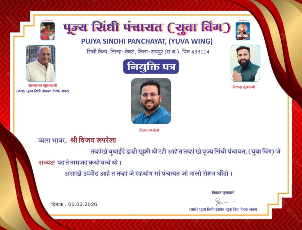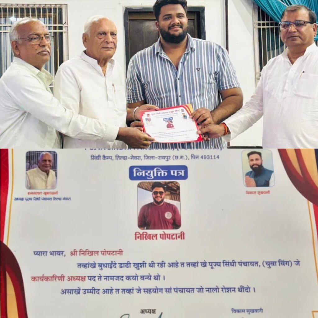 जारी नियुक्ति पत्र के अनुसार निखिल पोपटानी को पूज्य सिंधी पंचायत (युवा विंग) तिल्दा-नेवरा का कार्यकारिणी अध्यक्ष नियुक्त किया गया है। वहीं विजय रूपरेला को युवा विंग का अध्यक्ष बनाया गया है। नियुक्ति के बाद समाज के लोगों ने दोनों को बधाई देते हुए उज्ज्वल कार्यकाल की शुभकामनाएं दी हैं।