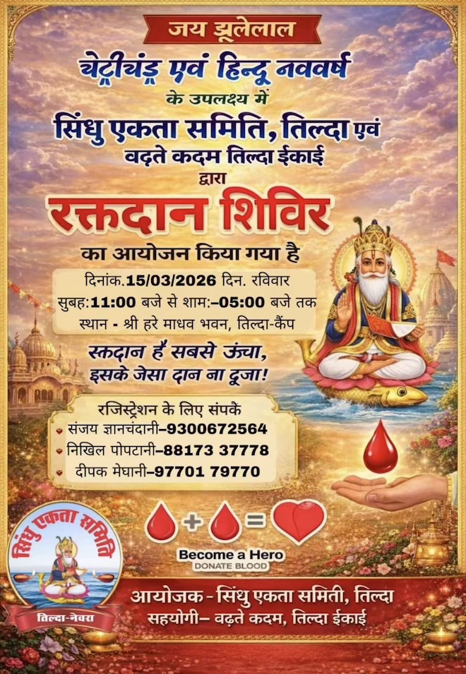 तिल्दा-नेवरा। चेट्रीचंड्र एवं हिंदू नववर्ष के पावन अवसर पर सिंधी समाज द्वारा सेवा भावना को आगे बढ़ाते हुए रक्तदान शिविर का आयोजन किया जा रहा है। यह शिविर रविवार 15 मार्च 2026 को श्री हरे माधव भवन, तिल्दा-कैंप में आयोजित होगा। शिविर का समय सुबह 11:00 बजे से शाम 5:00 बजे तक निर्धारित किया गया है।