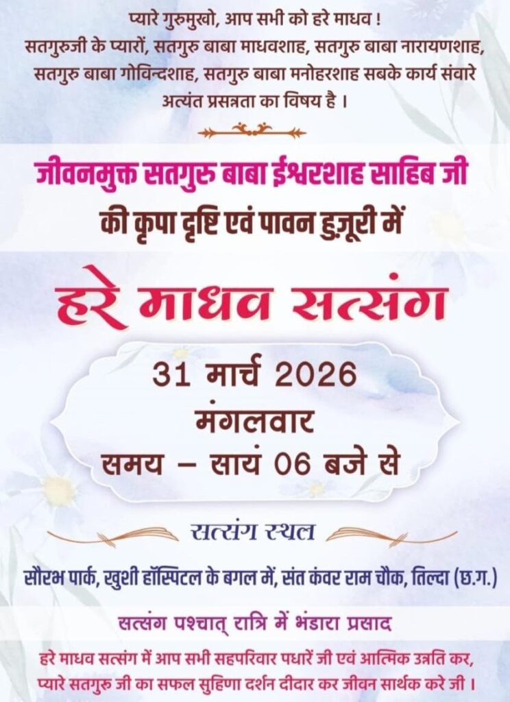 तिल्दा-नेवरा शहर में आध्यात्मिक वातावरण को नई ऊंचाई देने हेतु 31 मार्च 2026, मंगलवार को भव्य ‘हरे माधव सत्संग’ का आयोजन किया जा रहा है। जीवनमुक्त सतगुरु बाबा ईश्वरशाह साहिब जी की पावन हजूरी में आयोजित होने जा रहे इस कार्यक्रम को लेकर शहर सहित आसपास के ग्रामीण क्षेत्रों में जबरदस्त उत्साह और श्रद्धा का माहौल बना हुआ है।