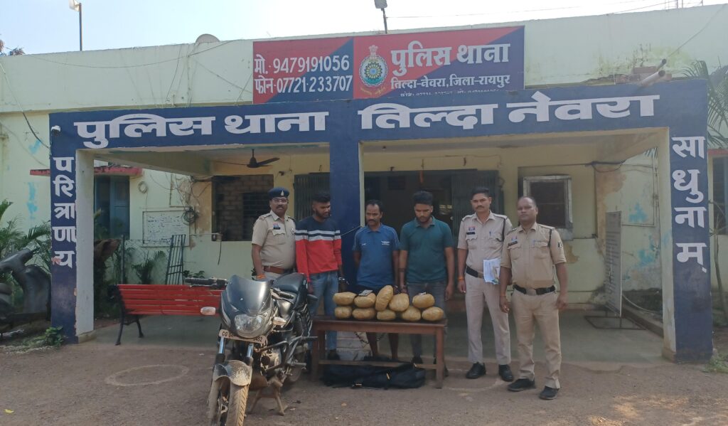 रायपुर रेंज के पुलिस महानिरीक्षक श्री अमरेश मिश्रा तथा पुलिस उप महानिरीक्षक एवं वरिष्ठ पुलिस अधीक्षक डॉ. लाल उमेद सिंह के निर्देशन में जिले में नशे के खिलाफ चलाए जा रहे विशेष अभियान “ऑपरेशन निश्चय” के तहत एण्टी क्राईम एण्ड साइबर यूनिट एवं थाना तिल्दा नेवरा पुलिस को बड़ी सफलता मिली है। पुलिस ने संयुक्त कार्रवाई के दौरान गांजा तस्करी करते तीन आरोपियों को रंगे हाथों गिरफ्तार किया है।