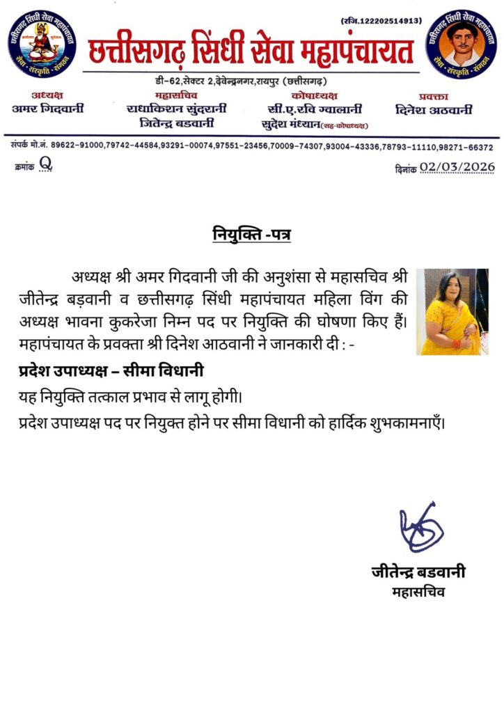 तिल्दा-नेवरा। छत्तीसगढ़ सिंधी सेवा महापंचायत द्वारा संगठन विस्तार के तहत महत्वपूर्ण नियुक्ति की घोषणा की गई है। अध्यक्ष अमर गिदवानी की अनुशंसा पर महासचिव जितेन्द्र बड़वानी तथा महिला विंग की अध्यक्ष भावना कुकरेजा की सहमति से सीमा विधानी को प्रदेश उपाध्यक्ष पद पर नियुक्त किया गया है। इस संबंध में महापंचायत के प्रवक्ता दिनेश आठवानी ने जानकारी देते हुए बताया कि यह नियुक्ति तत्काल प्रभाव से लागू होगी।